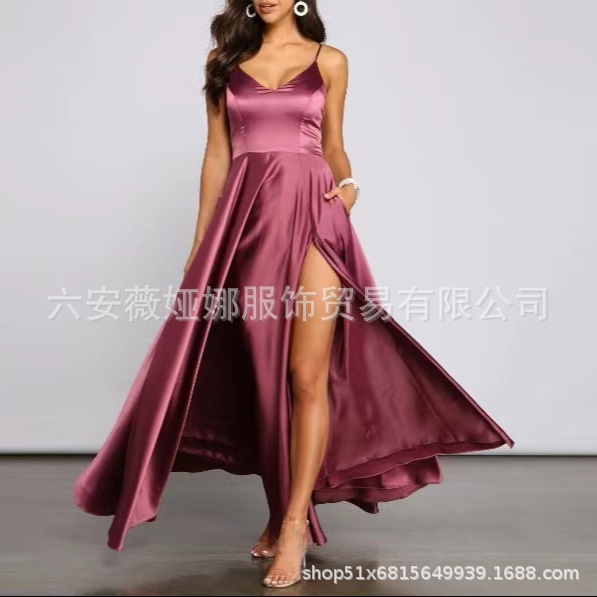 Gaun Malam Lintas Batas Model Baru Eropa dan Amerika Gaun Tali Sling Kain Satin Belahan Gaun Pesta Pesta Pesta Pesta Wanita Grosir Wanita