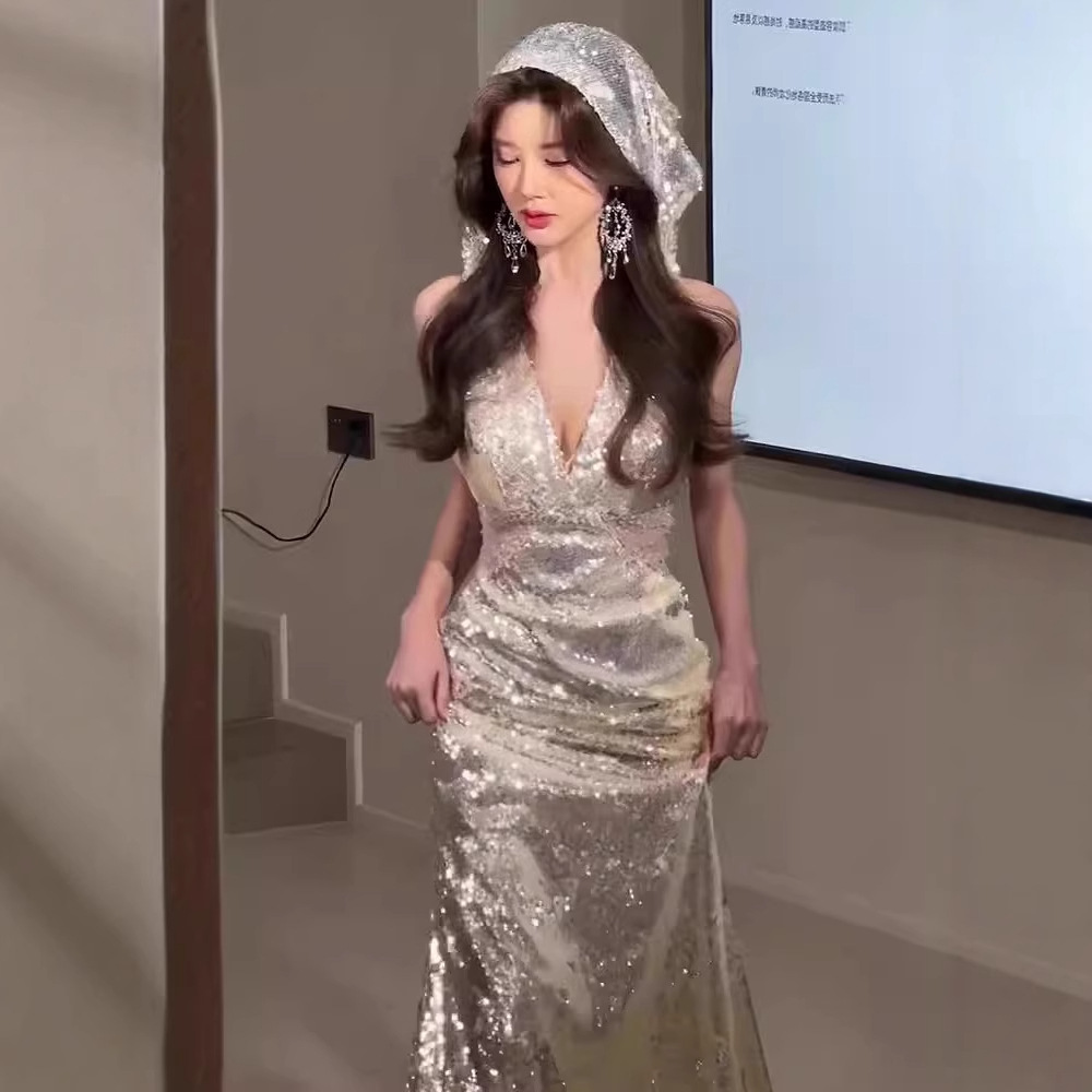Gaun Malam Pakaian Wanita Perjamuan Musim Panas 2025 Pakaian Bersulang Kerah V Seksi Model Baru Rok Ragam Ekor Ikan Payet Pekerja Berat Sosialita