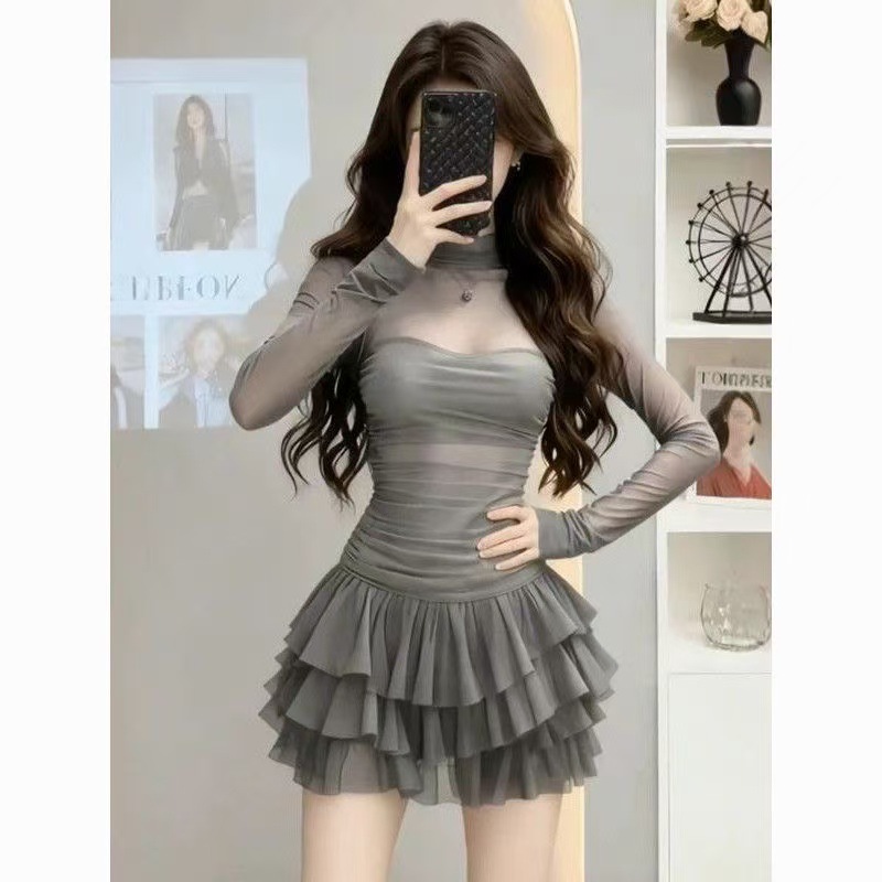 轻奢气质网纱拼接长袖深高领蛋糕裙女高级感法式宴会礼服