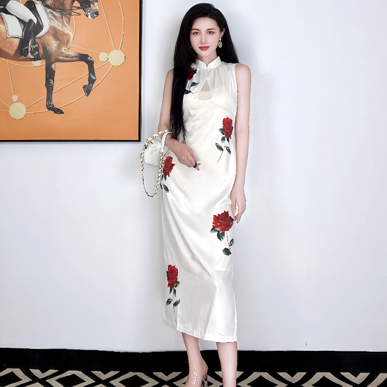 Gaun Cheongsam Kerah Bulat Tanpa Lengan Motif Bunga Mawar Model Sama dengan Liu Yifei Model Baru Musim Semi dan Musim Panas
