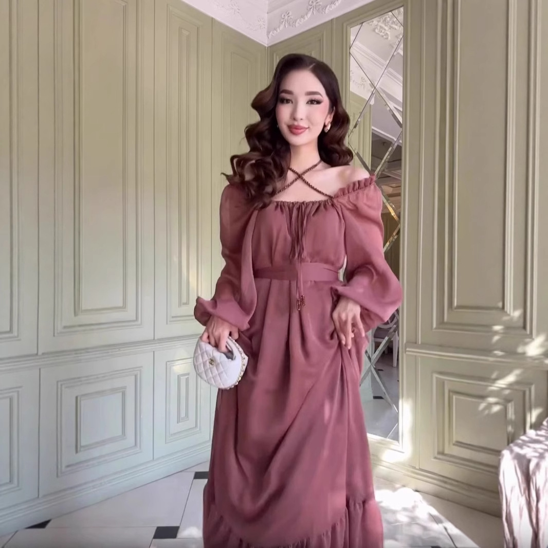 Gaun Terusan Wanita Rok Terusan Dua Lapis Lipit Kerah Lipit Kerah V Dalam Gantung Tali Model Eropa dan Amerika
