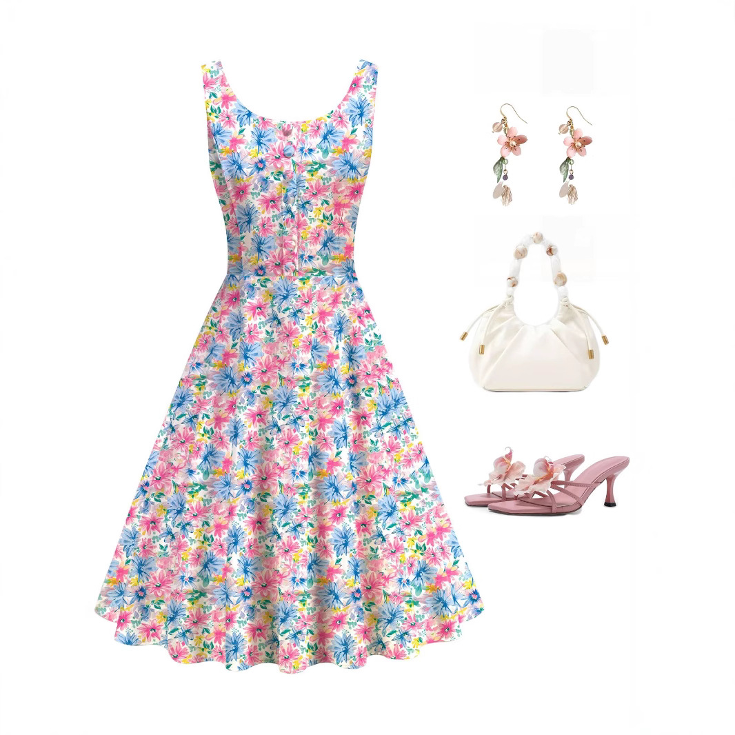 Perdagangan Luar Negeri Luar Negeri 1950S Gaun Pesta Reproduksi Tanpa Lengan Gaun Bermotif Kancing Musim Panas Gaun A-line Spot