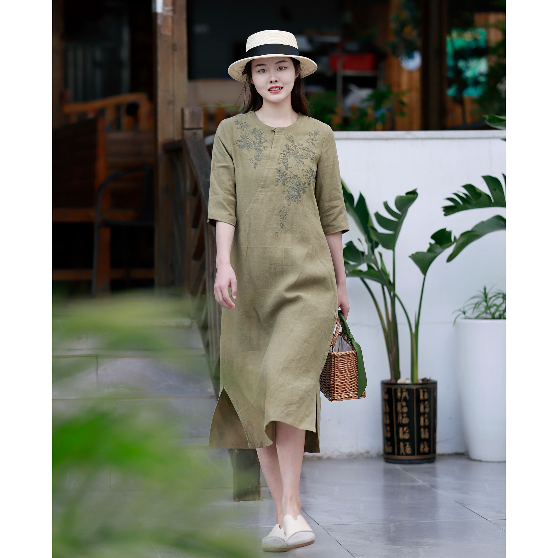 Dress wanita asli, pakaian wanita linen murni bordir berat peningkatan cheongsam artistik retro slim fit 23 musim semi dan panas