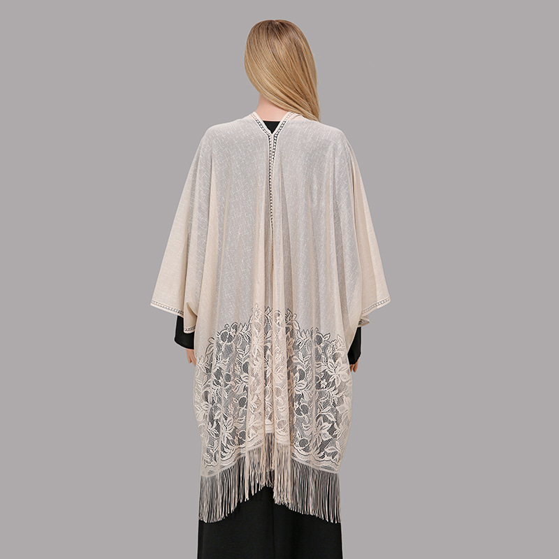 秋冬新款纯色蕾丝镂空流苏涤纶坎肩长款欧美优雅女士百搭旗袍披肩