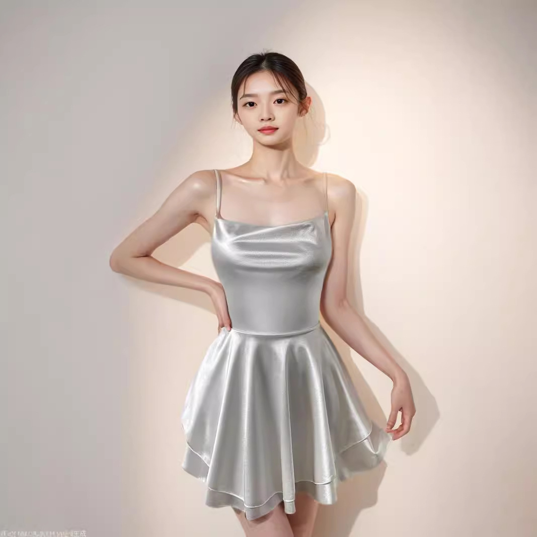 Pakaian Wanita Eropa dan Amerika 2025 Gaun Warna Polos Lengan Pendek Kerah V Berdiri Sendiri Amazon Gaun Asam Asetat Satin