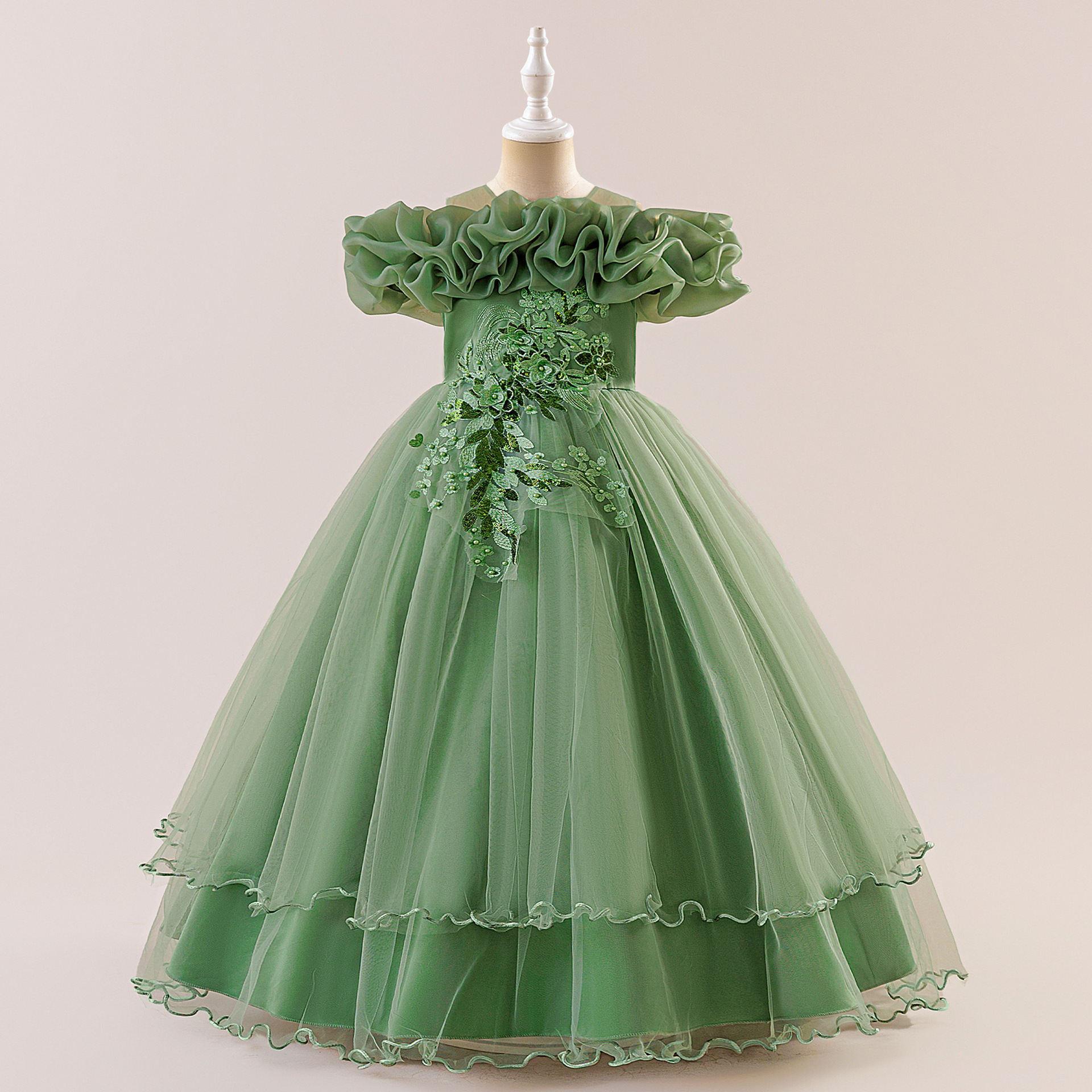 欧美女童礼服新款儿童珠片花朵单肩婚纱公主裙小女孩舞台派对礼服