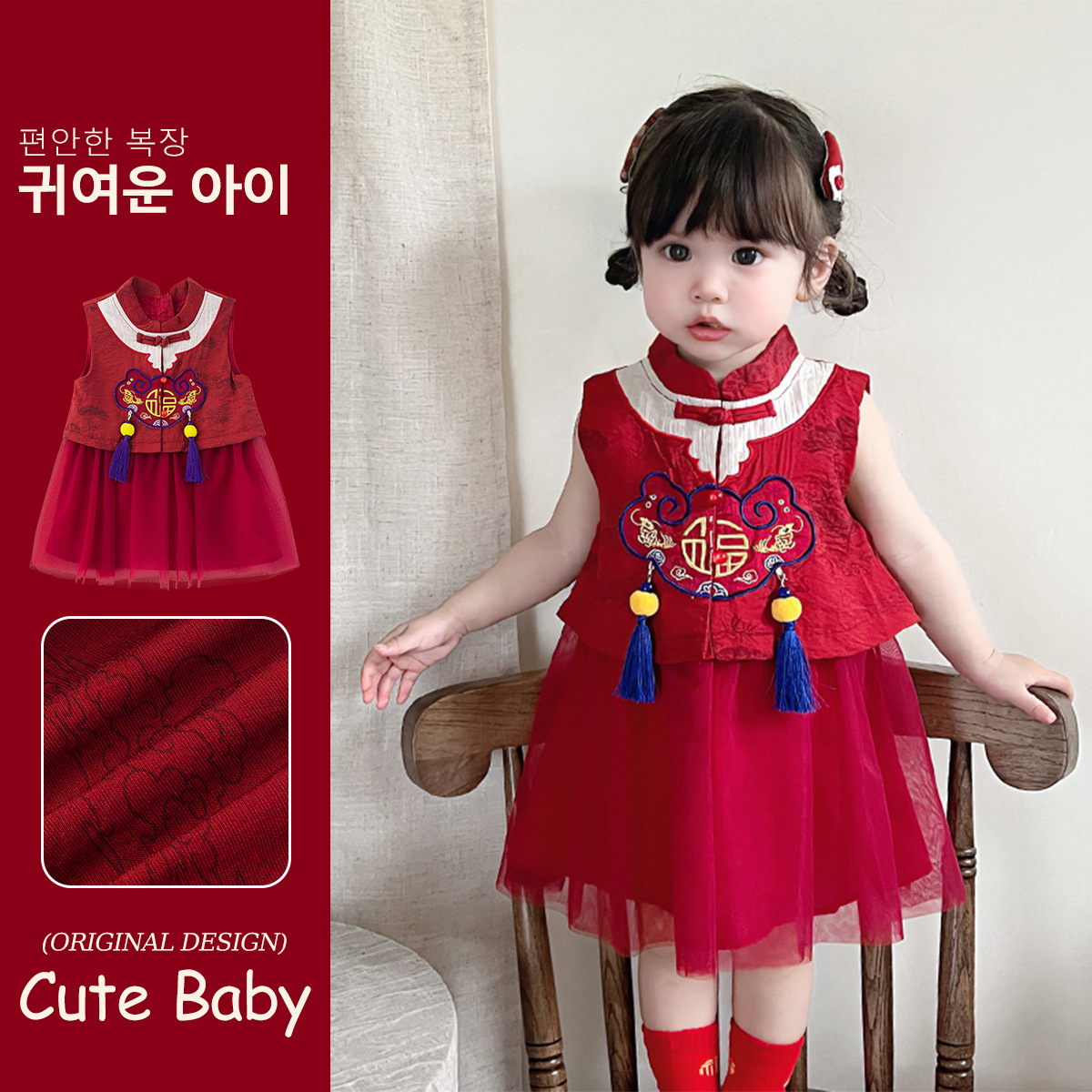 2025 Gaun Merah Baru Gaya Tiongkok Anak Perempuan Rok Putri Model Tipis Bayi Perempuan Musim Panas Rok Gaya Nasional Jaring 5296