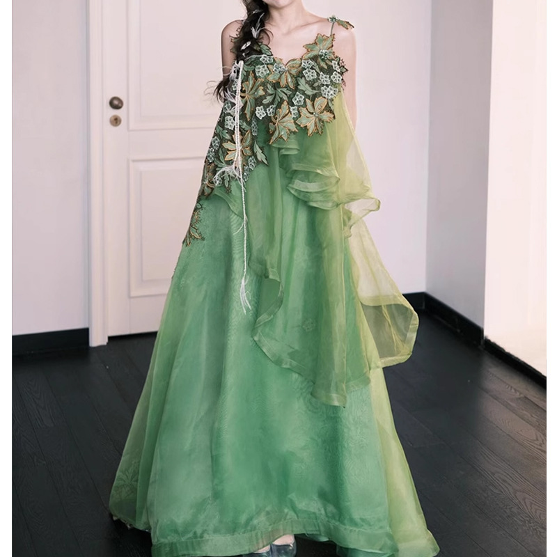 Gaun malam Eropa dan Amerika gaun tari tulle hijau perdagangan luar negeri gaun panjang seksi leher-v bunga leher V lengan puff