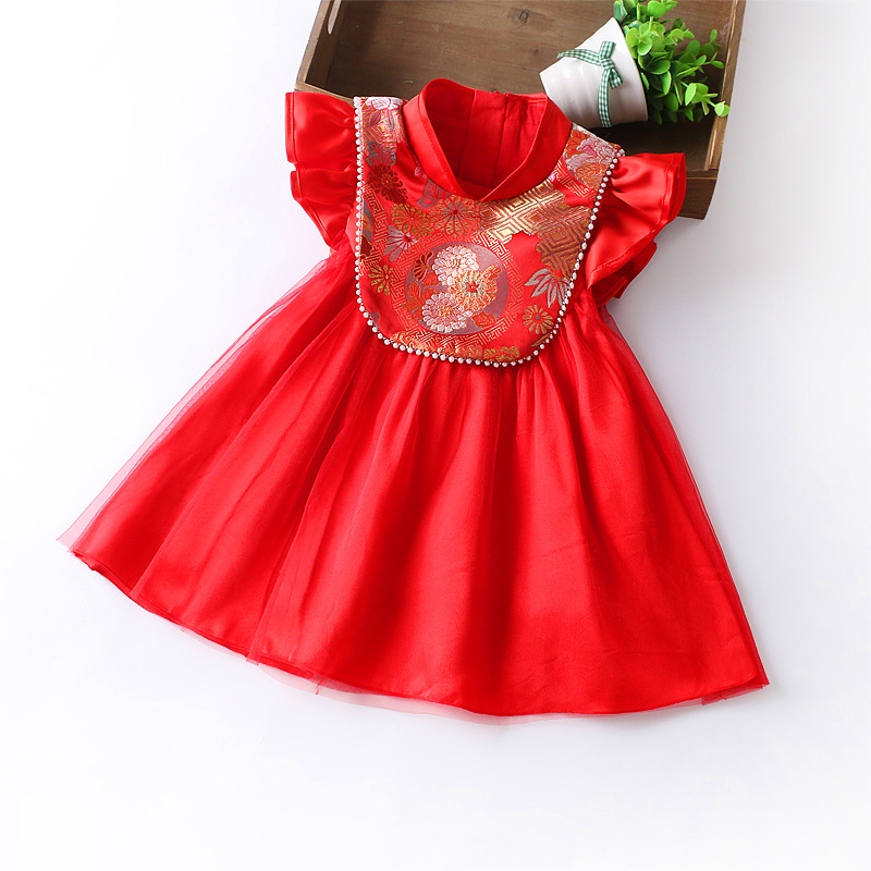 Gaun musim panas anak perempuan, gaun ulang tahun anak perempuan bayi tahun, bulan penuh, lengan terbang kecil, gaun putri merah, 8613