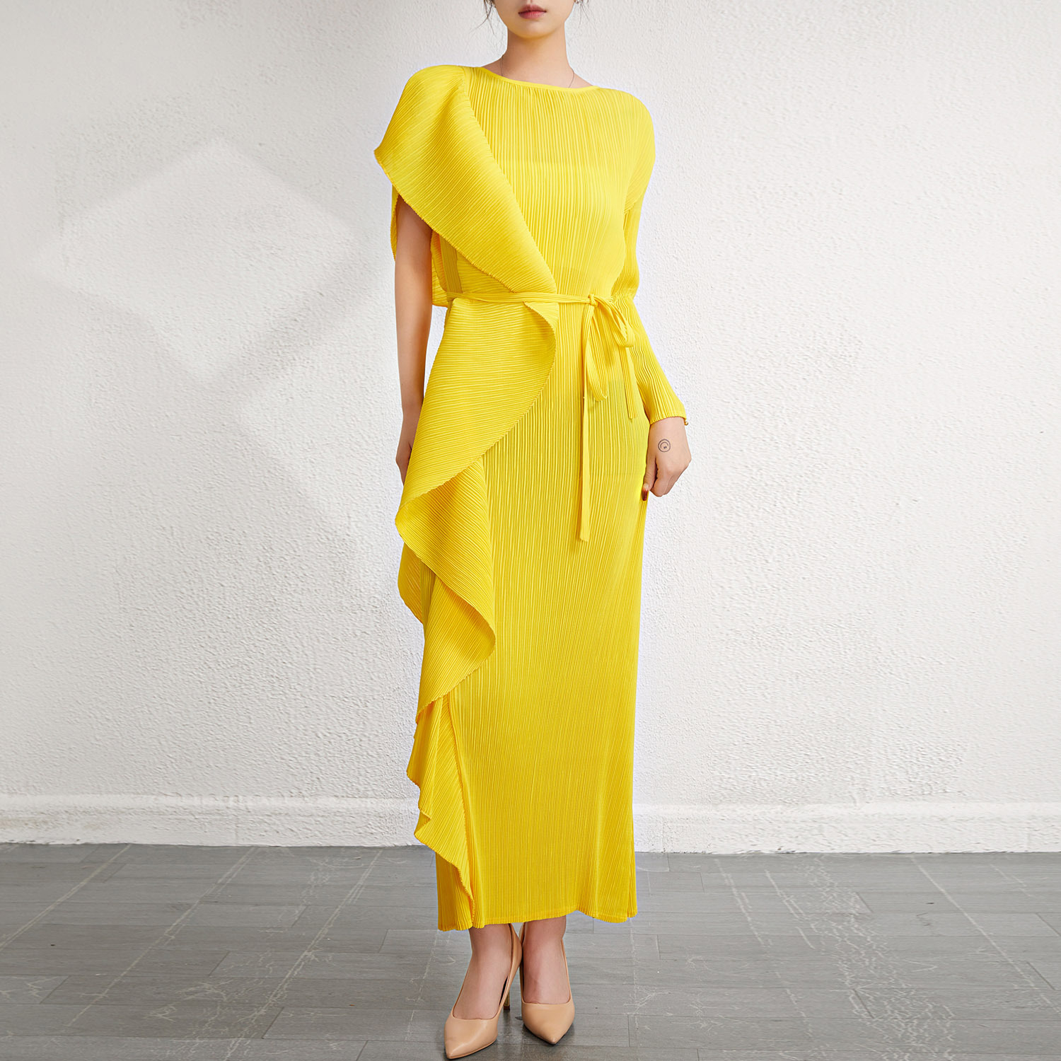 Gaun panjang temperamen slim-fit Mode lintas batas gaun panjang Sanzhai pakaian wanita desain gaun ketat pinggang berlipat tidak beraturan