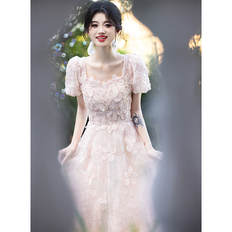 Gaun Pesta Ulang Tahun Upacara Orang dewasa Gaun Musim Wisuda Niche Mewah Ringan Gaun Pesta Perjamuan Kerah Persegi Gaya Prancis