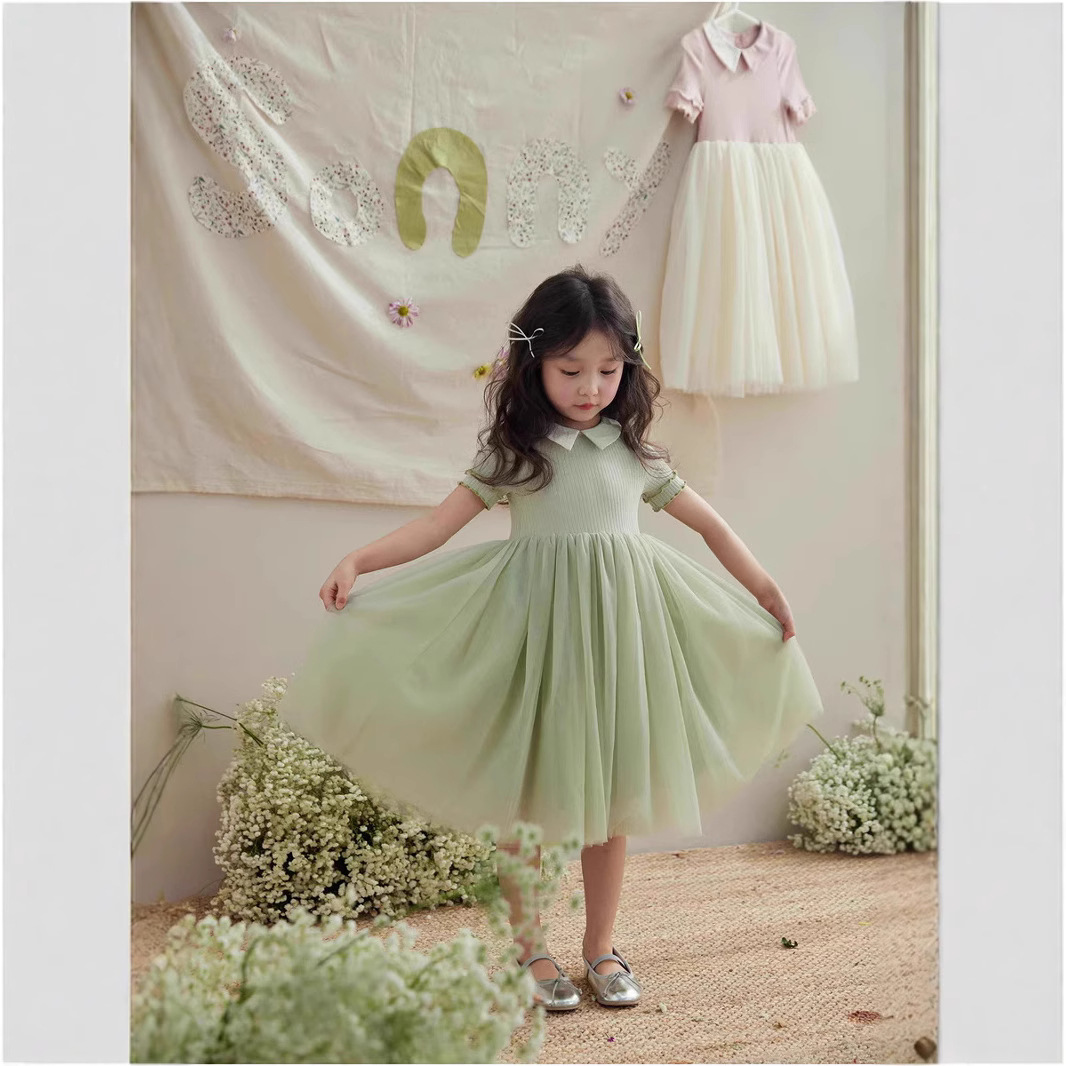 2025女童夏季网纱连衣裙芭蕾舞风格公主裙撞色翻领裙子小童A字裙