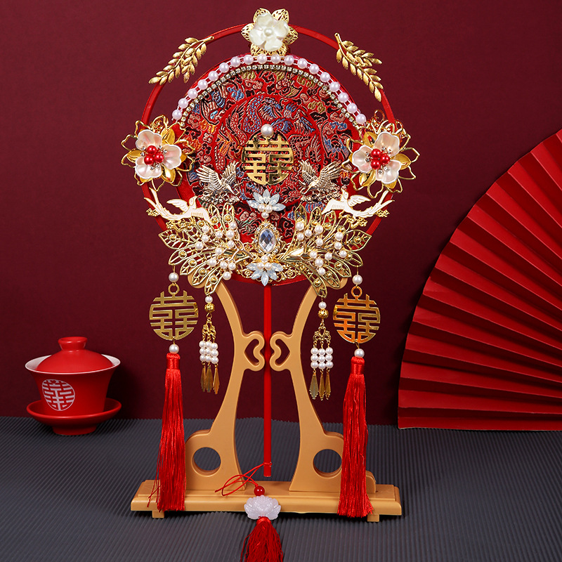 Kipas bulat dua sisi Xiuhe, gaun kipas pernikahan pengantin wanita, kipas gaya kuno gagang panjang, kipas pernikahan