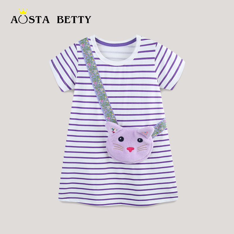 25夏季新款儿童连衣裙欧美风卡通猫咪包包女童公主裙时尚条纹童裙