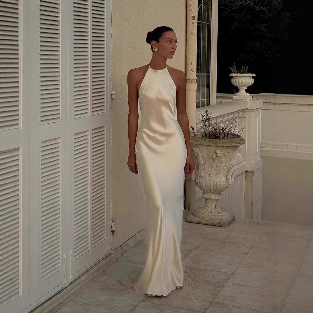 Gaun Tali Gantung Leher Terbuka Seksi Gaya Prancis Eropa dan Amerika Lintas Batas Gaun Rok Panjang Terlihat Langsing Asam Asetat Satin Imitasi Sederhana