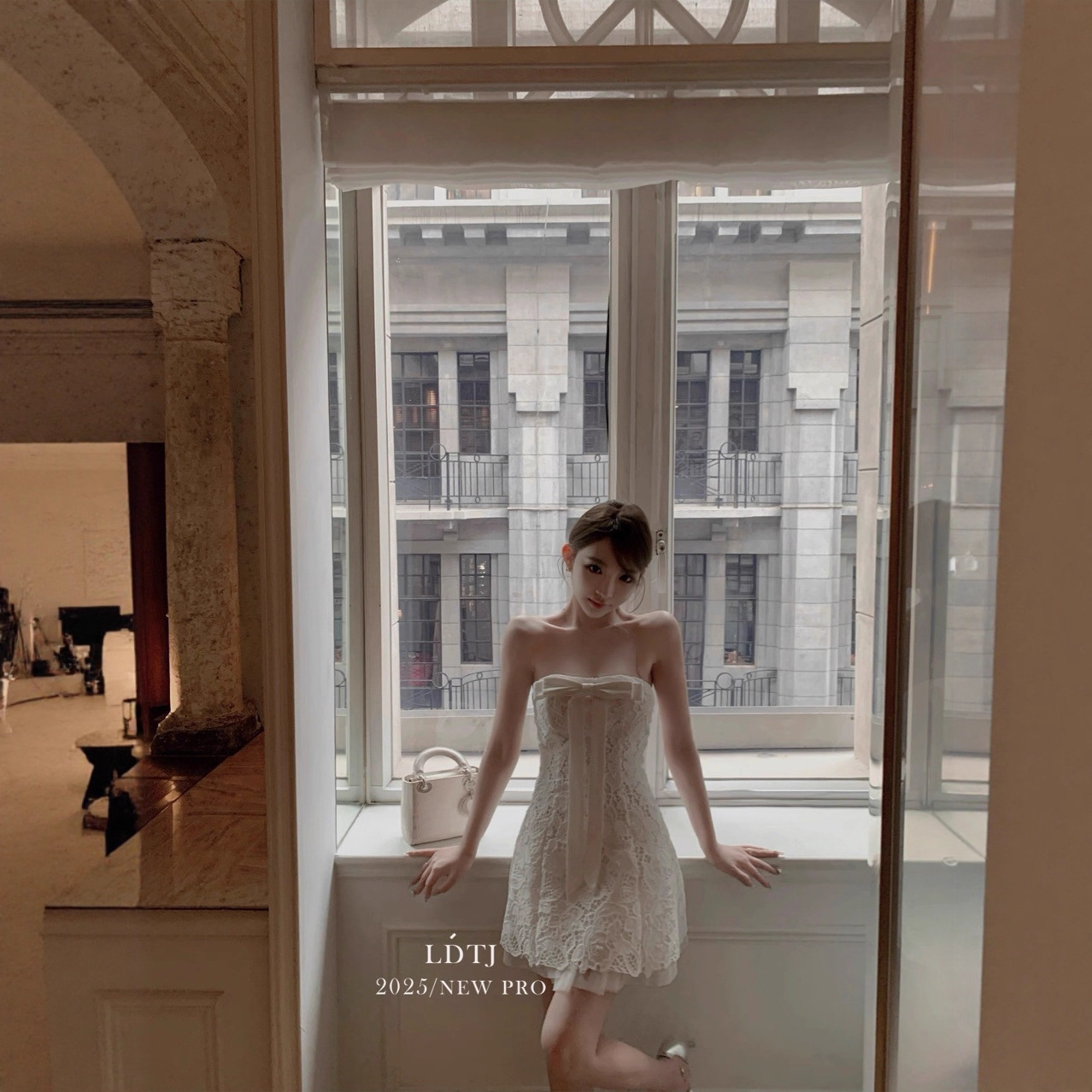 LDTJ原创 2025夏纯欲法式气质抹胸蝴蝶结生日进口蕾丝连衣短裙女