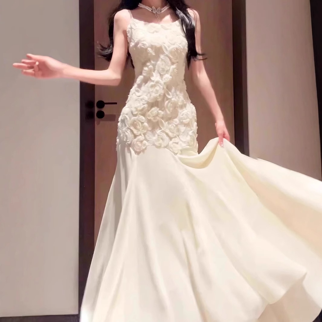 Model Baru Musim Panas 2025 [Meja Tenun Bunga] Gaun Suspender Mawar Bordir Gaya Perancis Gaun Membentuk Pinggang Elegan Mewah Ringan Rok Ekor Ikan