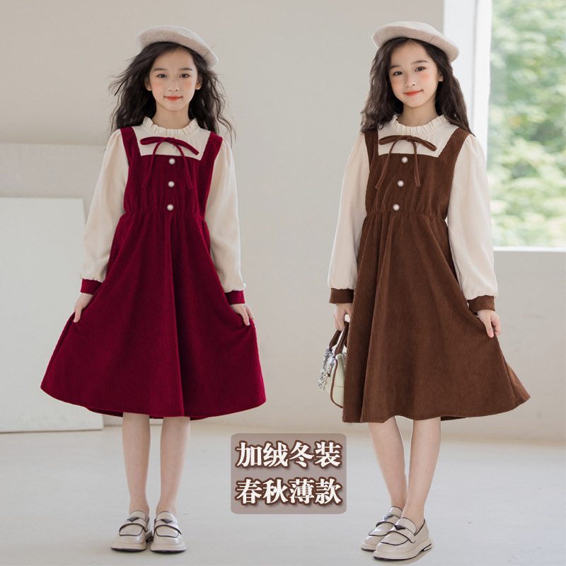 Gaun dua potong palsu untuk anak perempuan, koleksi musim gugur 2025, gaun putri warna-warni untuk anak-anak yang lebih besar, gaun meriah berlapis bulu merah