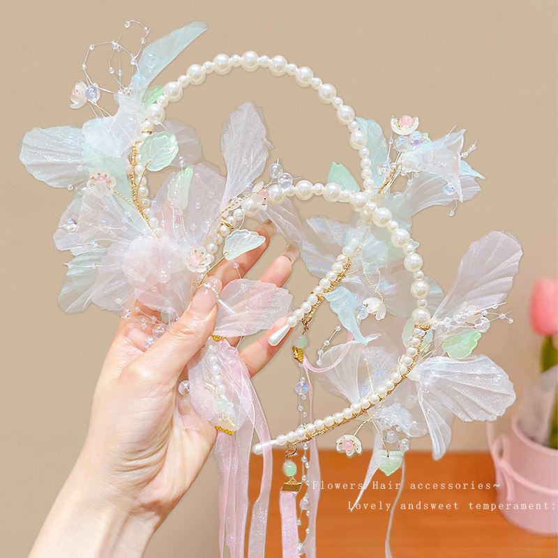 Aksesori rambut anak-anak hiasan kepala gaun putri bunga hiasan kepala gaun mutiara anak perempuan mahkota karangan bunga gaya kuno
