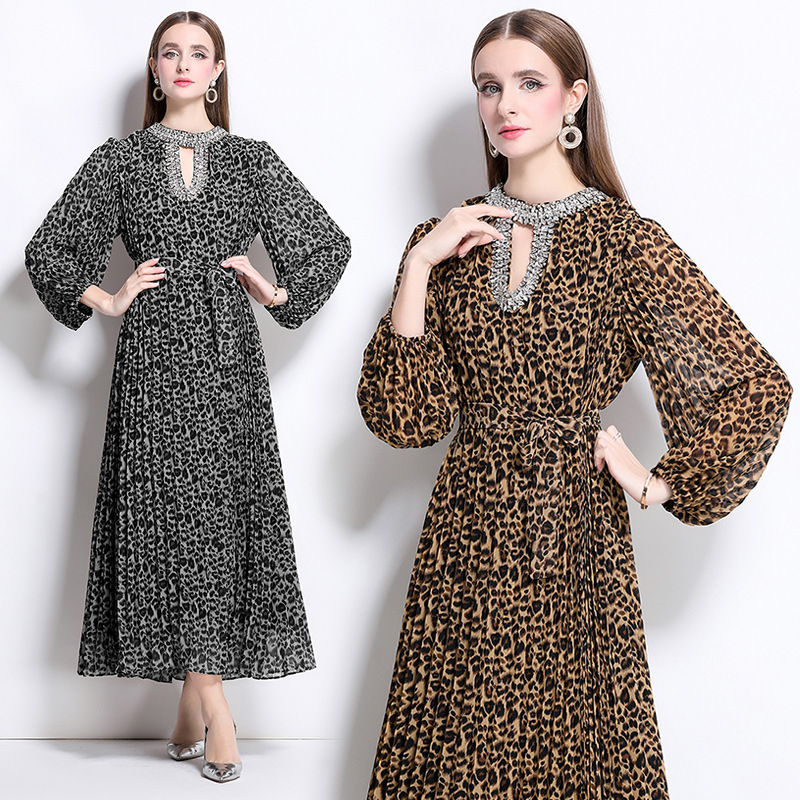 Gaun Pesta Bertabur Berlian dengan Kerah Industri Berat Kemewahan Gaya Eropa Amerika Gaun Elegan Lengan Panjang Motif Macan Tutul Musim Semi Musim Panas Wanita