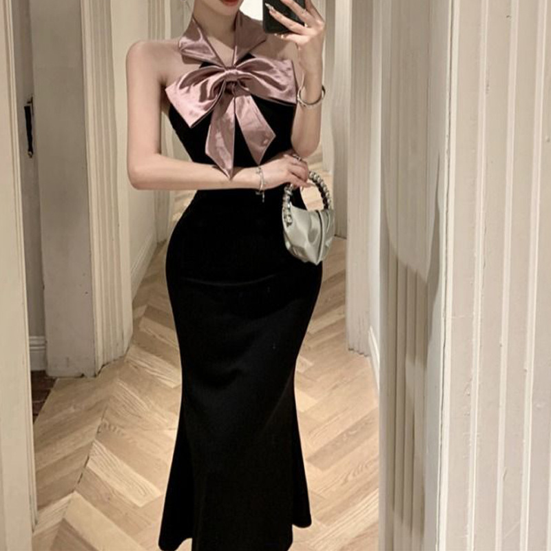 Gaun Malam Cantik Pita Kupu-Kupu Gaya Prancis Gaya Hepburn Rok Wanita Musim Panas Seksi Punggung Gantung Leher Menutupi Pinggul
