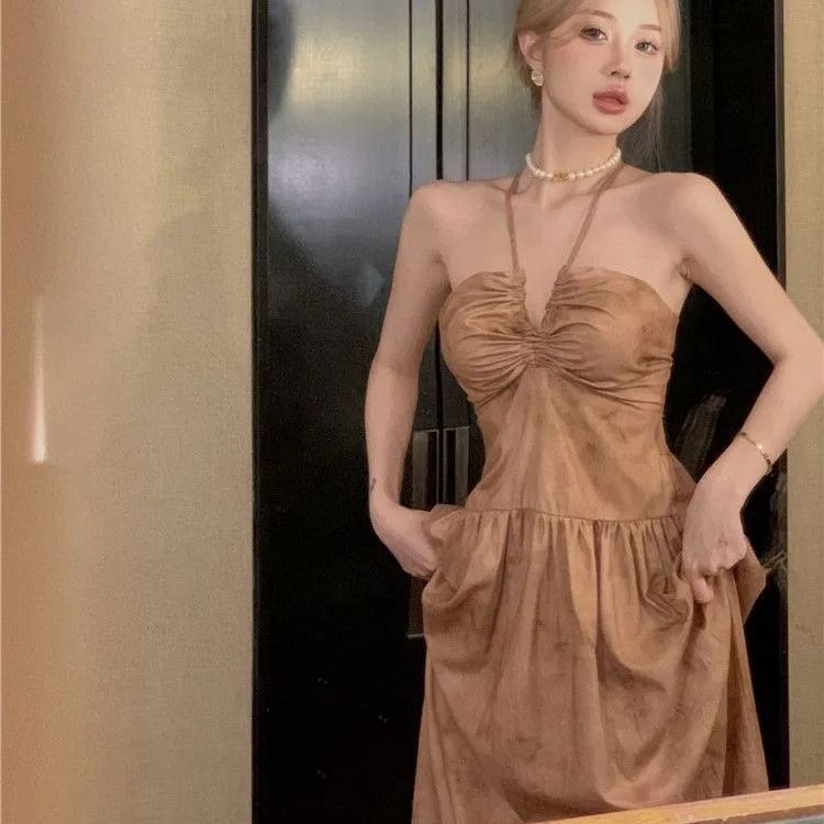 Gaun halter gaya Perancis, gaun halter panjang setengah tali kelas atas, gaun ketat retro pinggang punggung terbuka