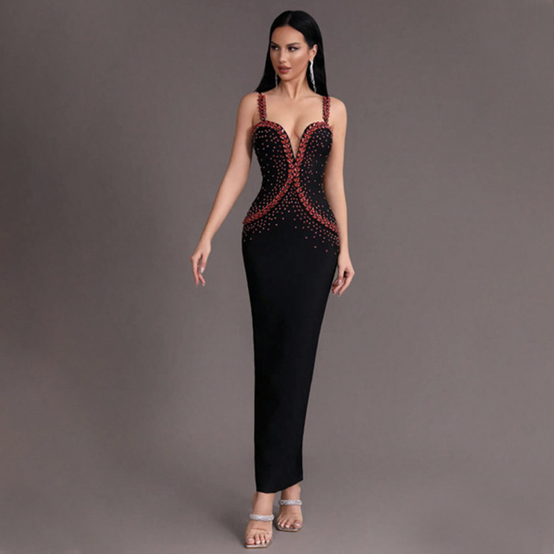 Amazon AliExpress Perdagangan Luar Negeri Tali Gantung Hitam Kerah V Berlian Merah Gaun Seksi Sosialita Gaun Gaun