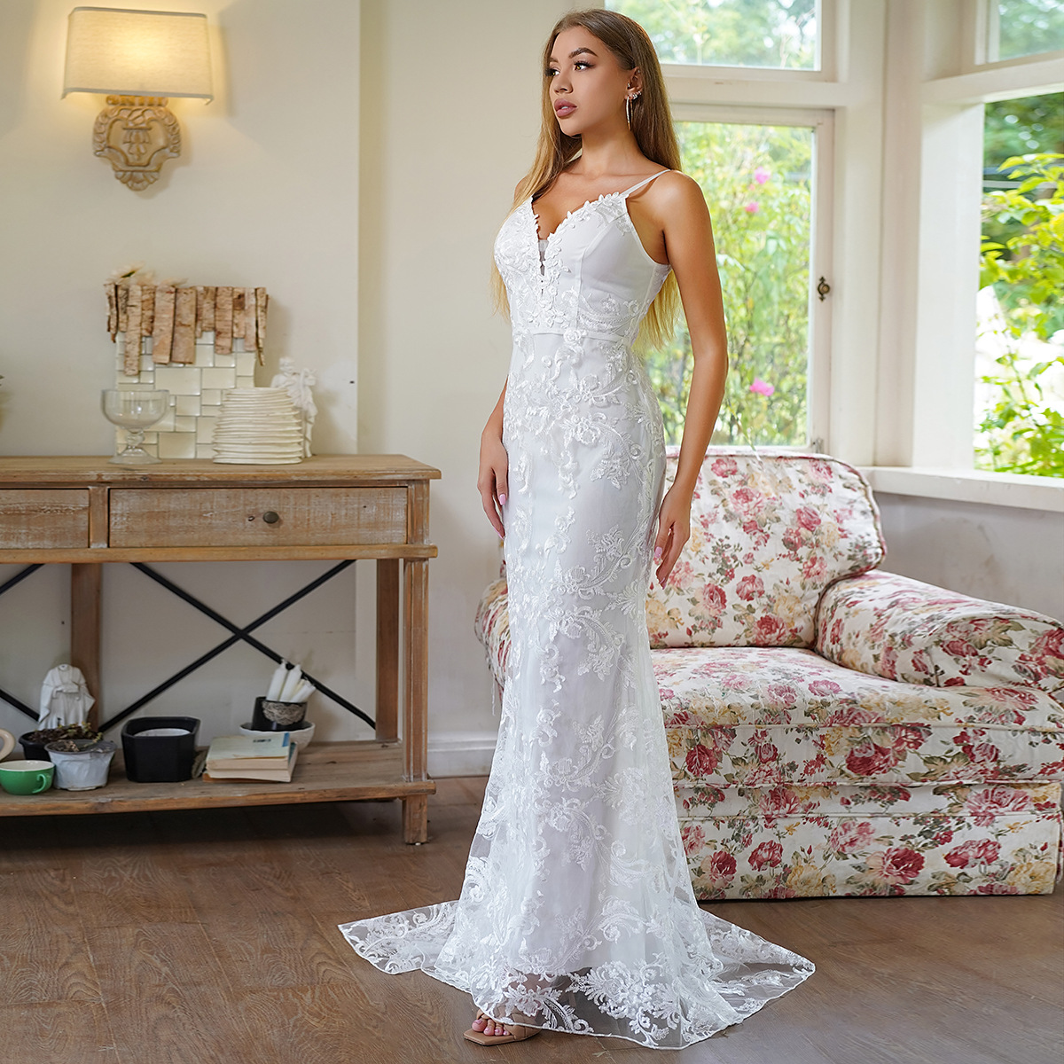 Diskon besar Amazon pakaian wanita lintas batas Eropa dan Amerika gaun populer tali seksi V-neck gaun pernikahan trailing besar