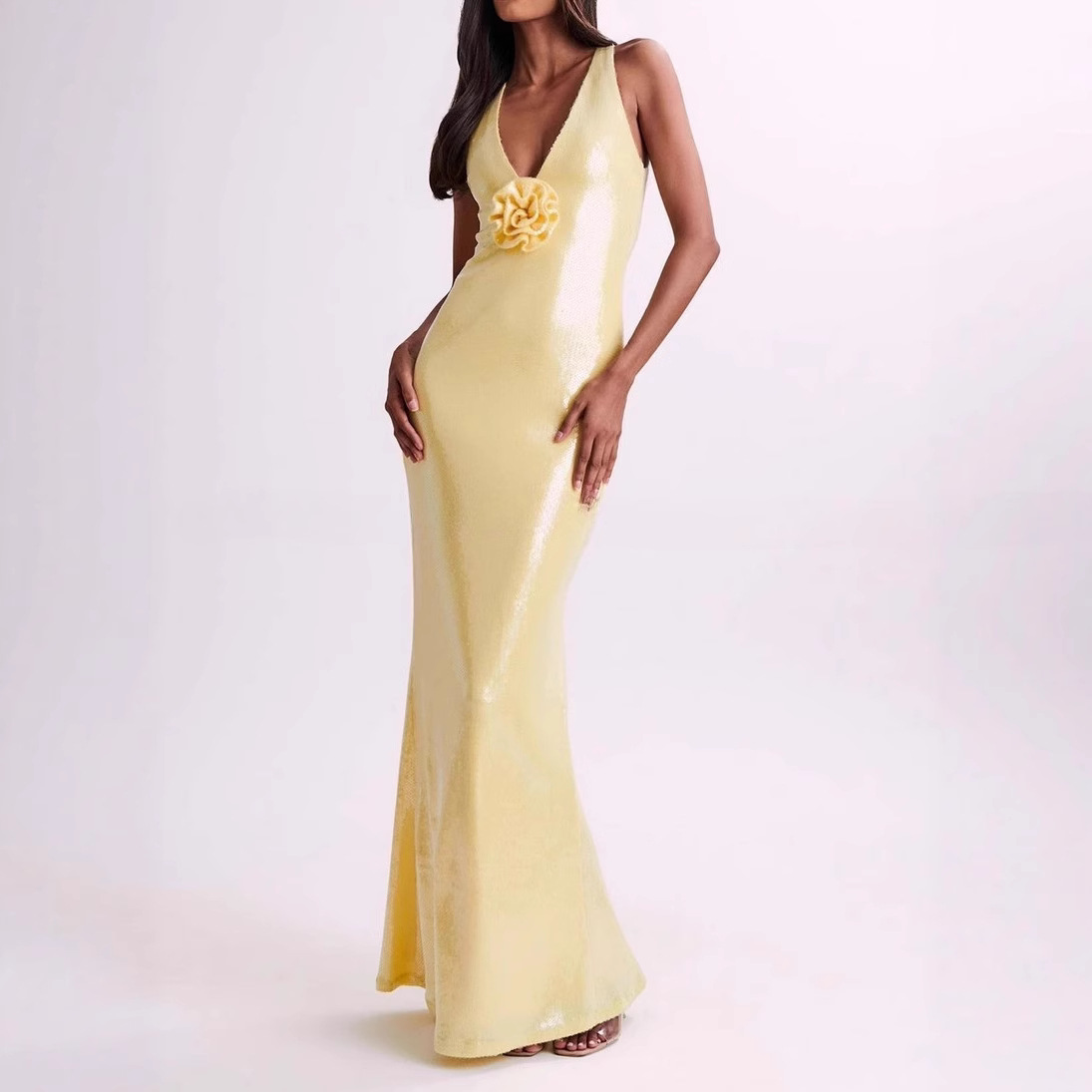 Pakaian Luar Negeri Eropa dan Amerika Gaun Gantung Leher Payet Gaya Kakak Perempuan Membentuk Badan Seksi Tanpa Lengan Kerah V Gaun Malam Kuning Rok Panjang Wanita