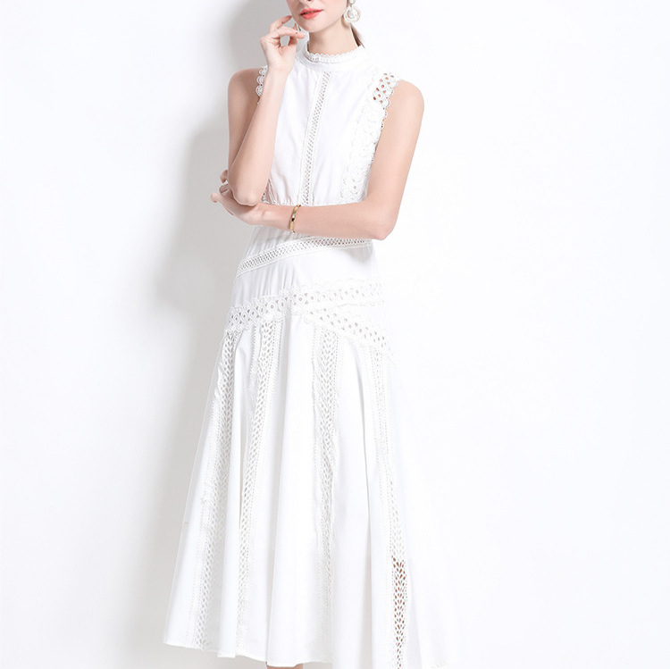 Gaun Membentuk Pinggang Tanpa Lengan Penyambungan Renda Berongga Gaya Senior Mage Rok Panjang Elegan Elegan Terlihat Langsing Musim Panas Wanita
