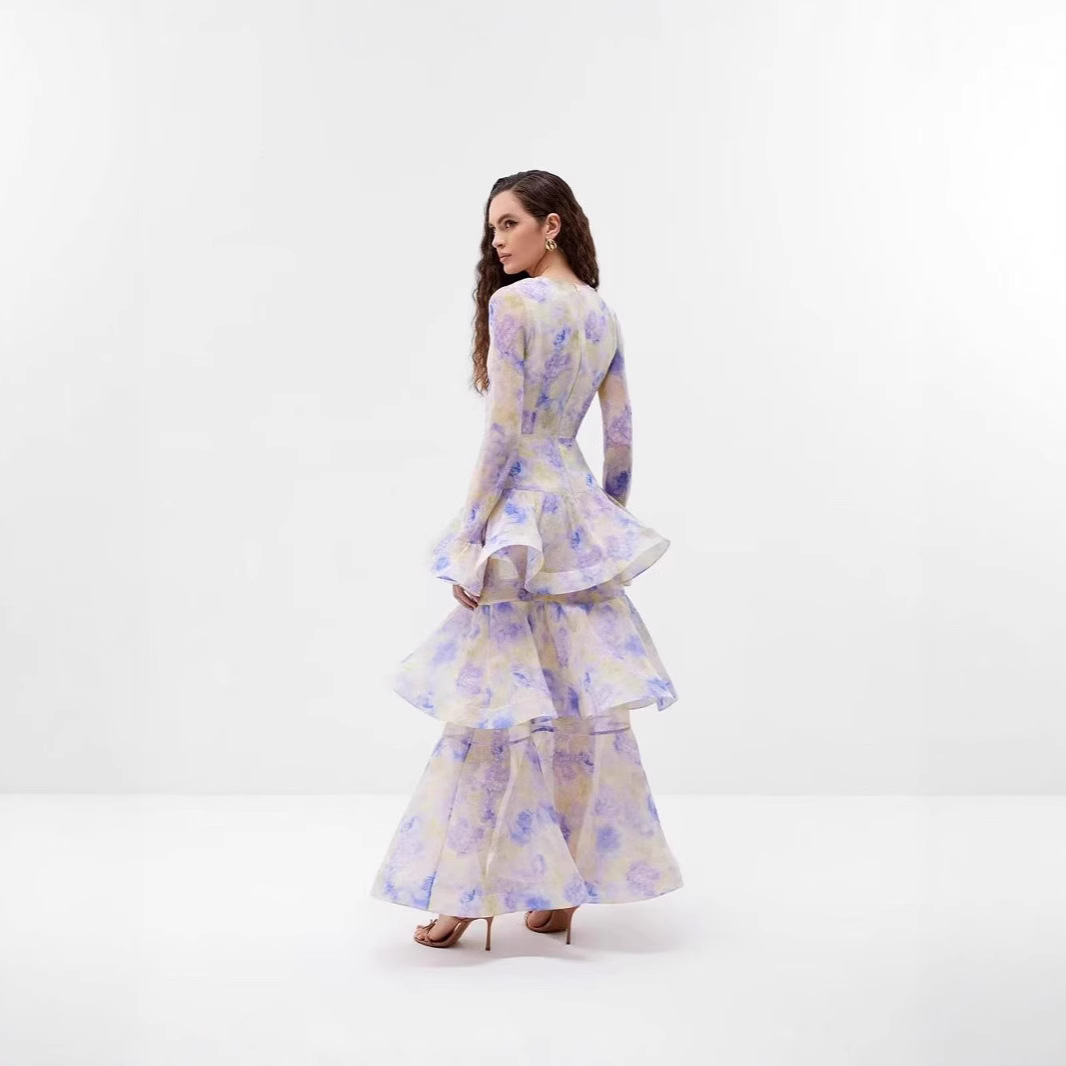 Rok Pakaian Mewah Ringan Bertingkat Tinggi Lintas Batas Eropa Amerika Rok Kue Model Panjang Bercorak Lengan Panjang Kerah V Model Baru Modis Musim Panas Wanita