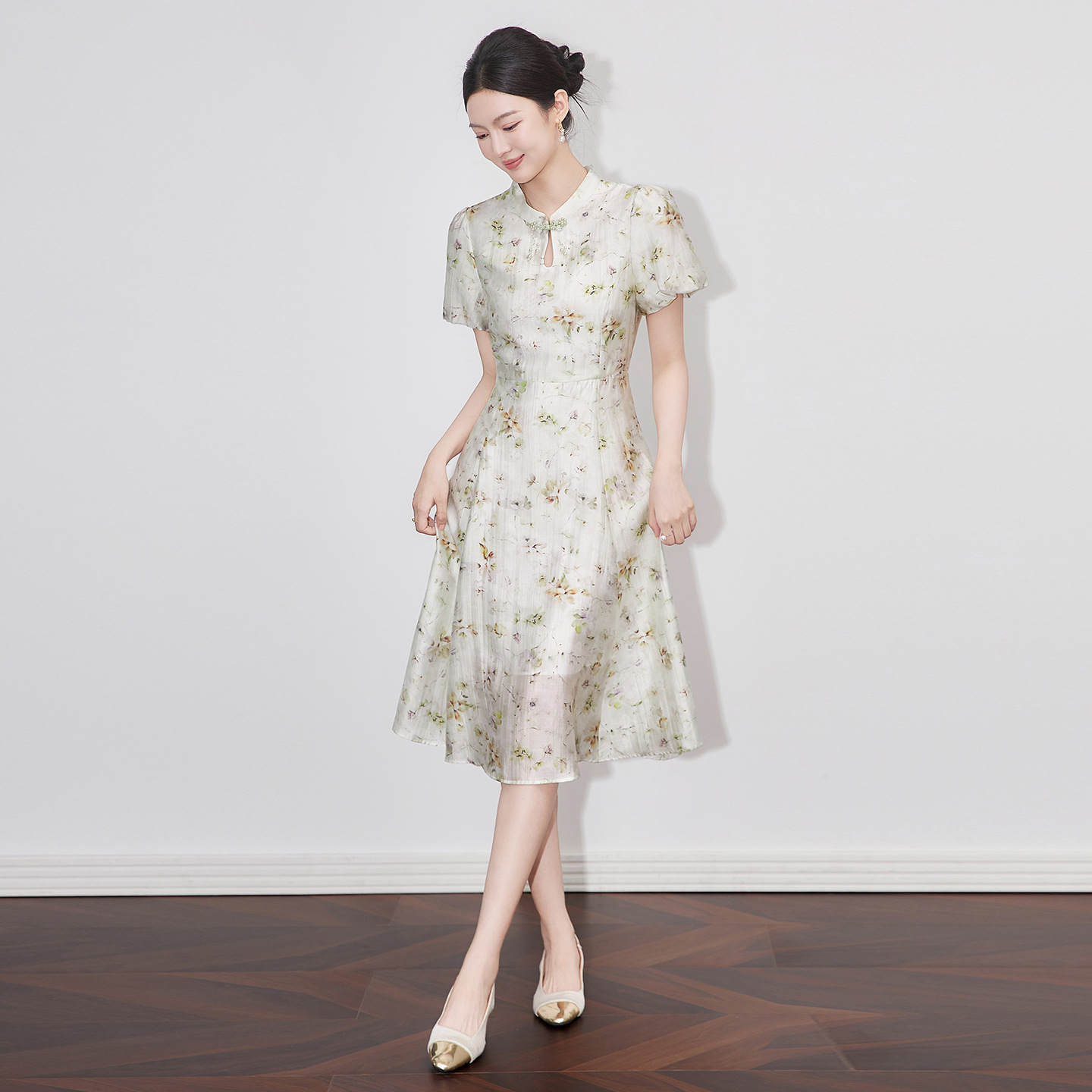 2509707-Cheongsam Gaya Tiongkok Baru Cetakan Gaun Rami Langsing Wanita Musim Panas Model Baru Elegan Terlihat Langsing