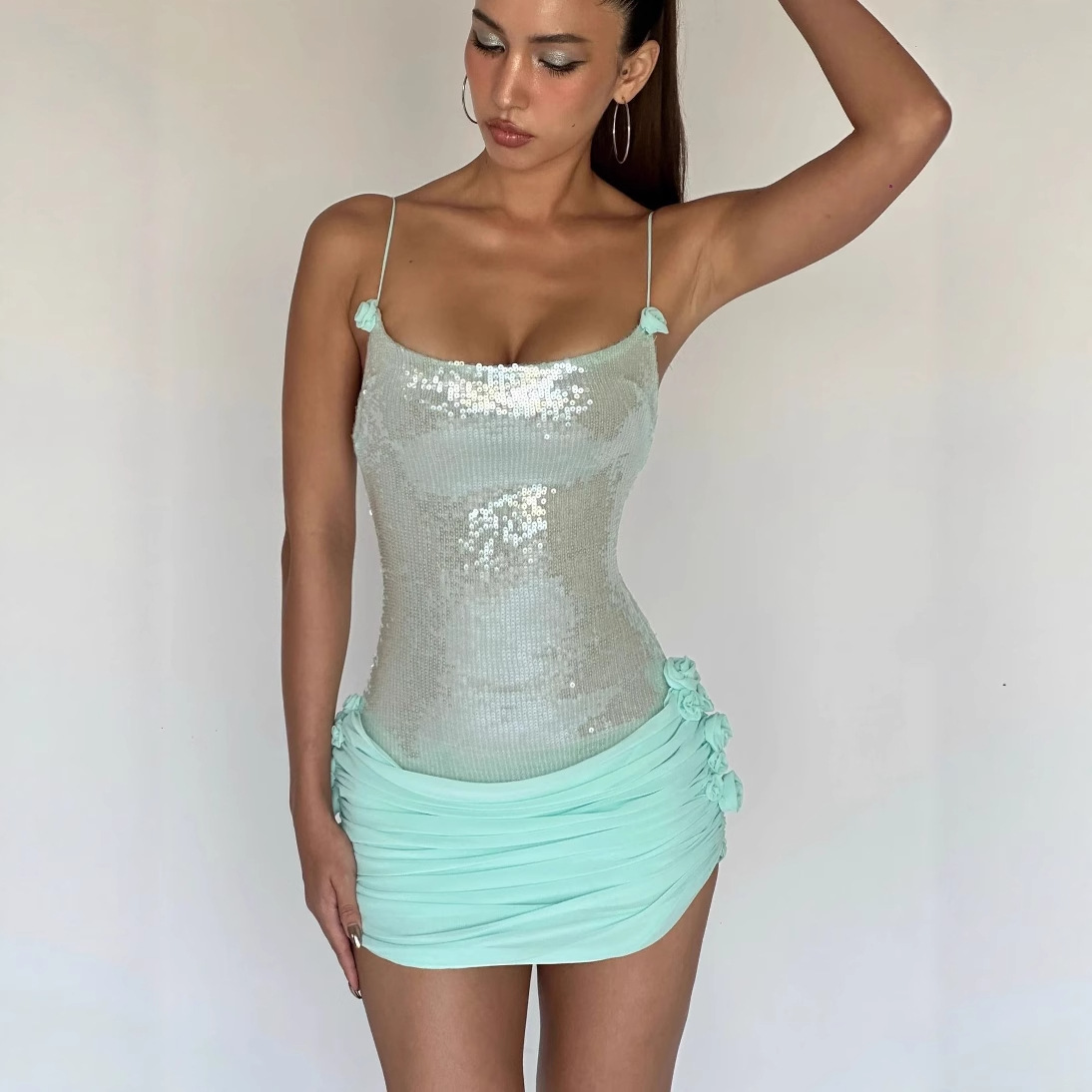 Pakaian Wanita Eropa dan Amerika High-end High-end High-end Seksi Gaun Tali Payet Payet Gaun Elegan Gaun Dekorasi Bunga Slim-fit