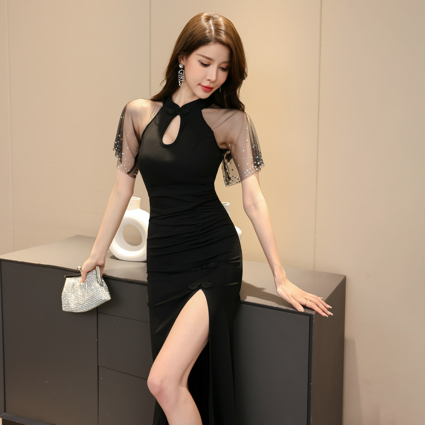 Gaun panjang cheongsam seksi canggih gaya Tiongkok baru gaun panjang lengan pendek retro modifikasi gaya Tiongkok 2222