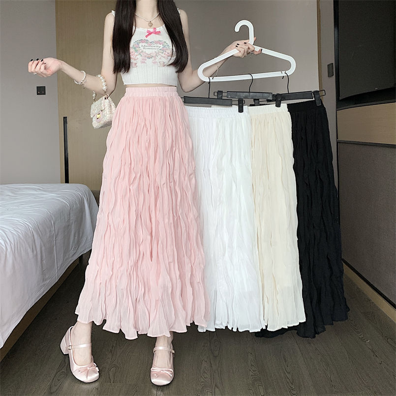 Rok Setengah Badan Pinggang Elastis Warna Putih Crossborder A-line Rok Panjang Elegan Kasual Pinggang Tinggi Model Baru 2025 Musim Panas Wanita Trendi