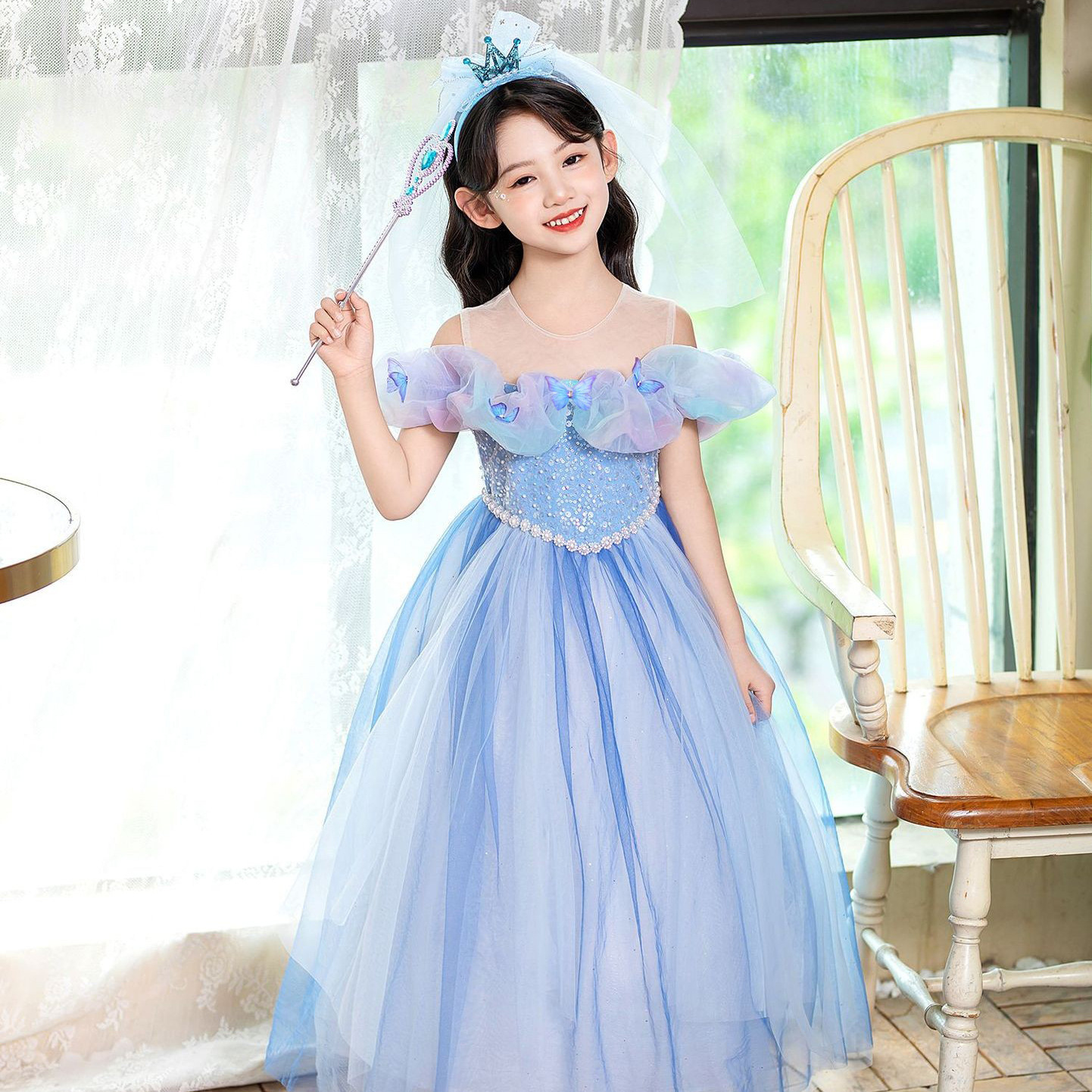 新款蝴蝶元素网纱公主连衣裙一字肩礼服连衣裙女童生日节日礼物礼