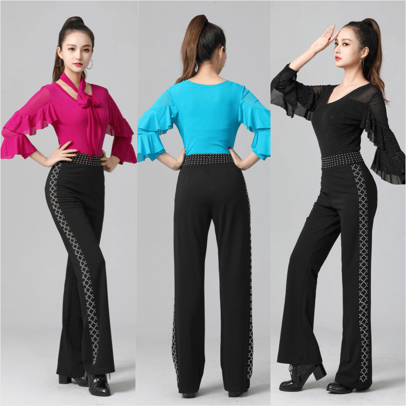 Gitba pakaian dansa Latin tiga langkah, atasan lengan panjang langsing persegi panjang langit berbintang hitam baru