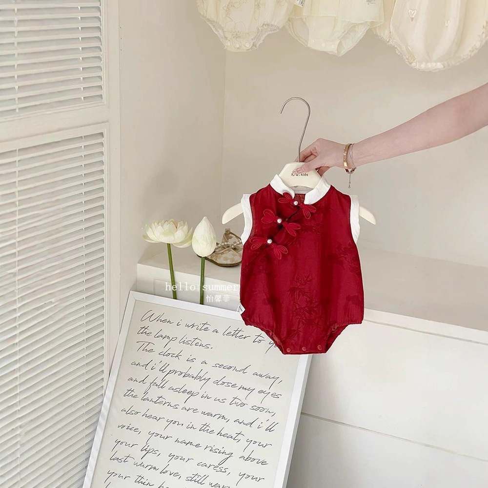 新款婴儿衣服夏季薄款红色喜庆旗袍哈衣女宝宝夏装百天包屁衣