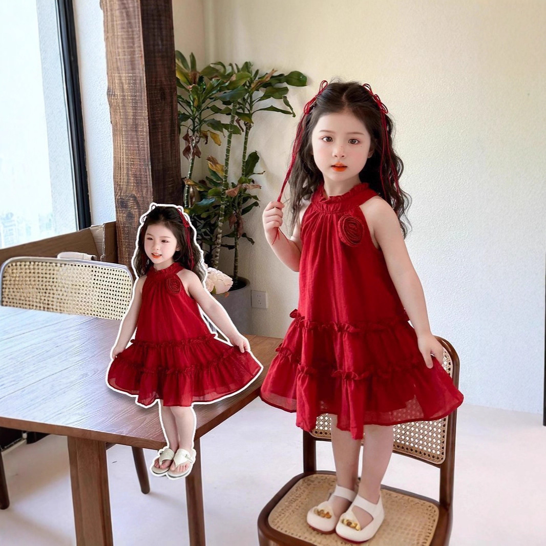 甜美女童夏连衣裙2025新款红玫瑰连衣裙时尚洋气挂脖连衣裙公主裙