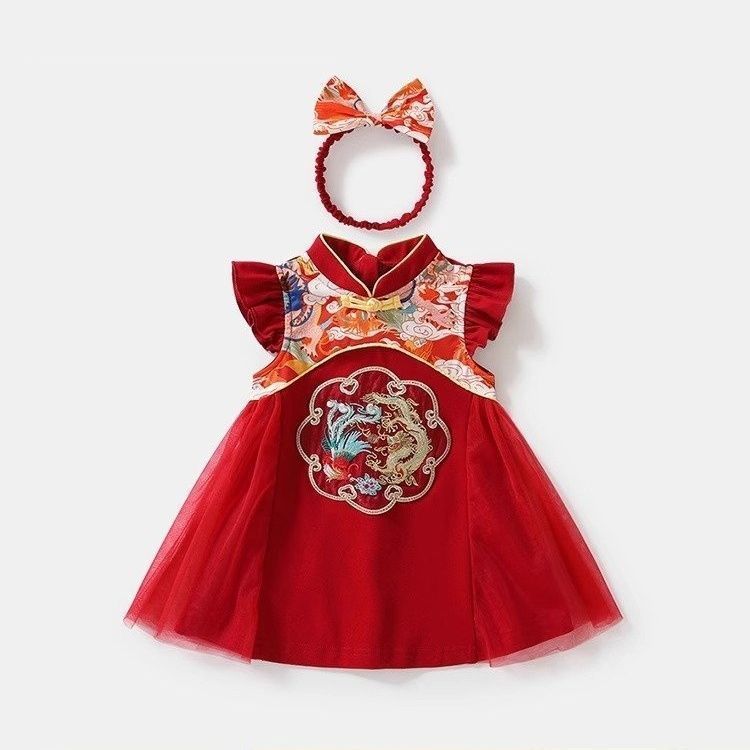 女童夏季周岁宝宝中式礼服公主连衣裙安可拉红新中式生日春季裙子