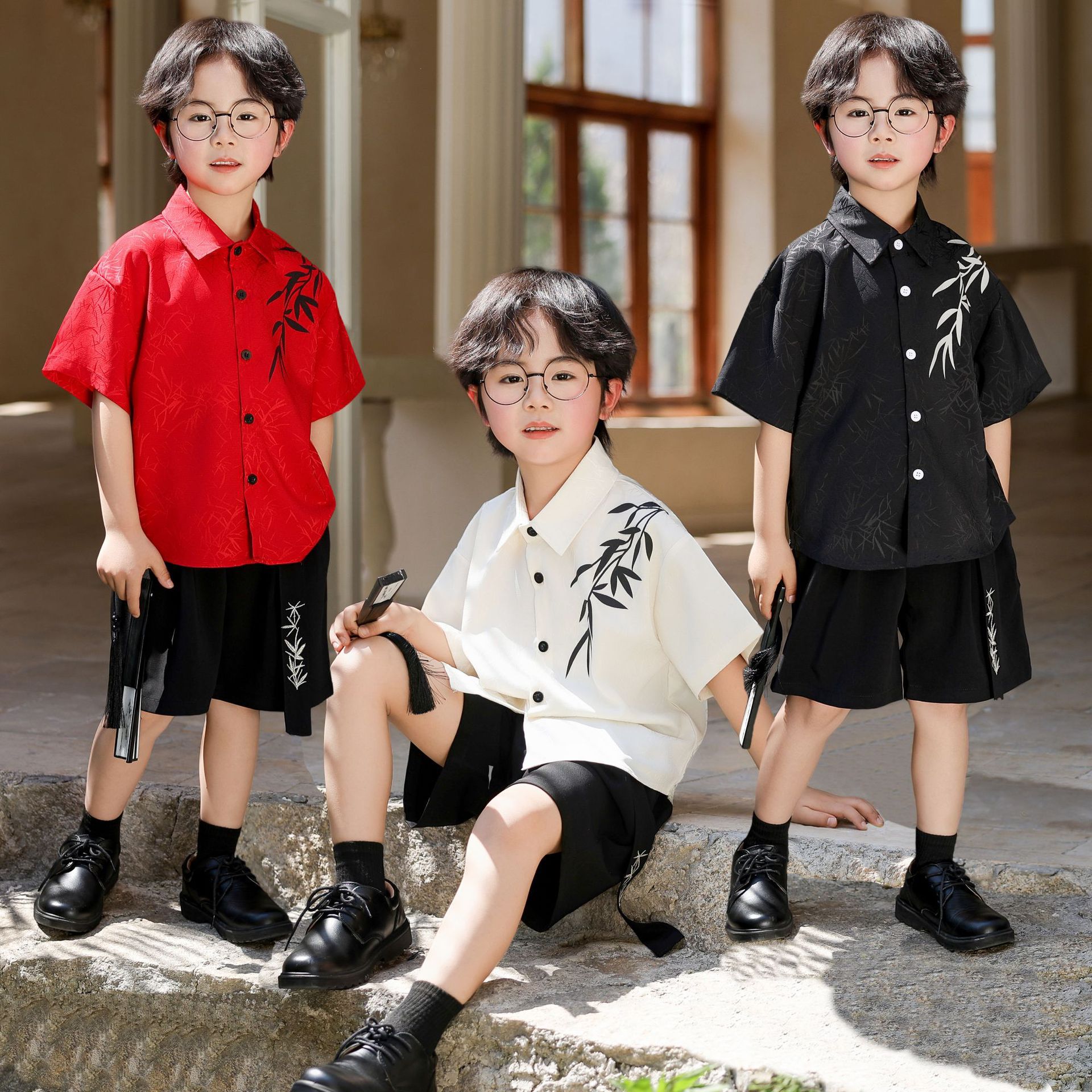 Kemeja Lengan Pendek Jacquard Anak Laki-Laki Gaya Tiongkok Baju Kemeja Tampan Anak Setelan Pakaian Anak Trendi Nasional Pakaian Pertunjukan