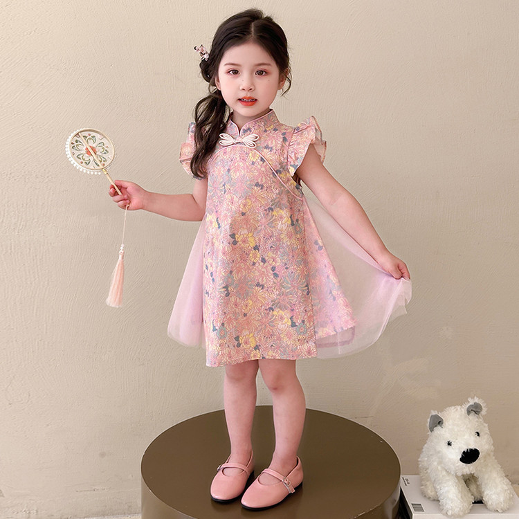 Gaun Cheongsam Berikat Gaya Tionghoa Anak Perempuan Rok Putri Elegan Lengan Terbang Gaya Tionghoa Bayi Model Baru Musim Panas 2025