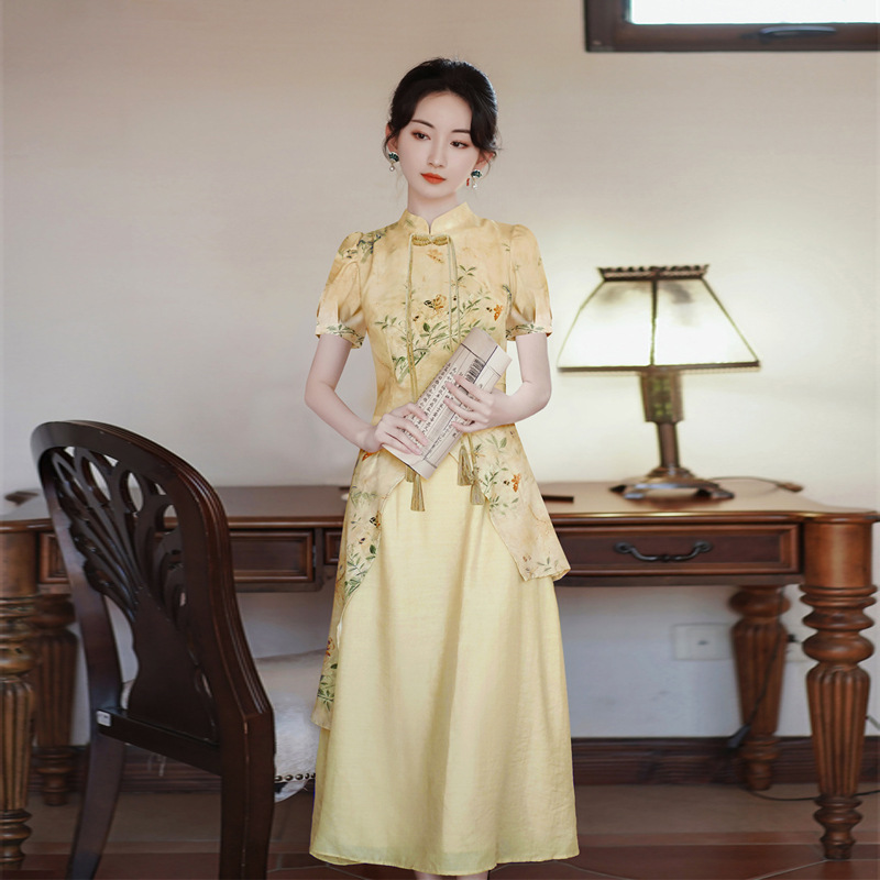 Baju wanita retro gaya Tiongkok, baju cheongsam harian wanita dua potong, set musim semi dan panas 662