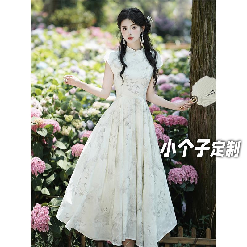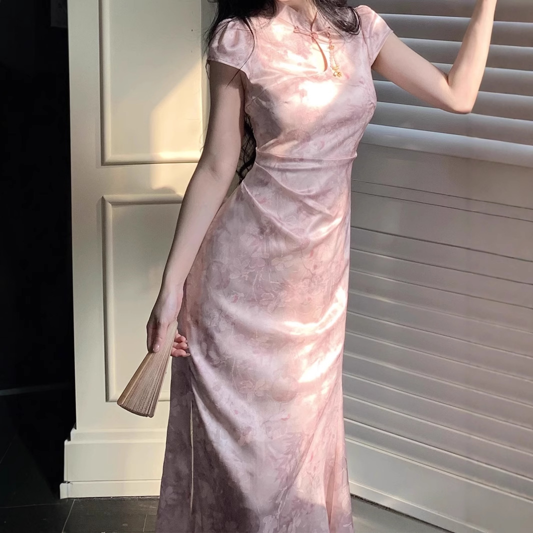 Gaun cheongsam panjang sedang Hangzhou 2024 wanita cetak muda lengan pendek musim panas retro