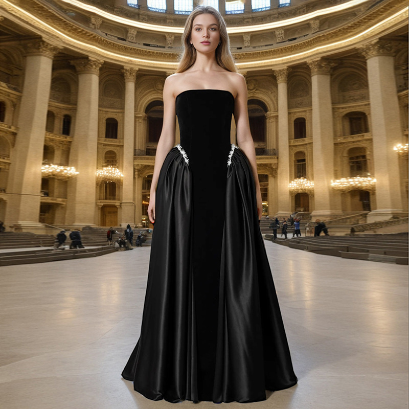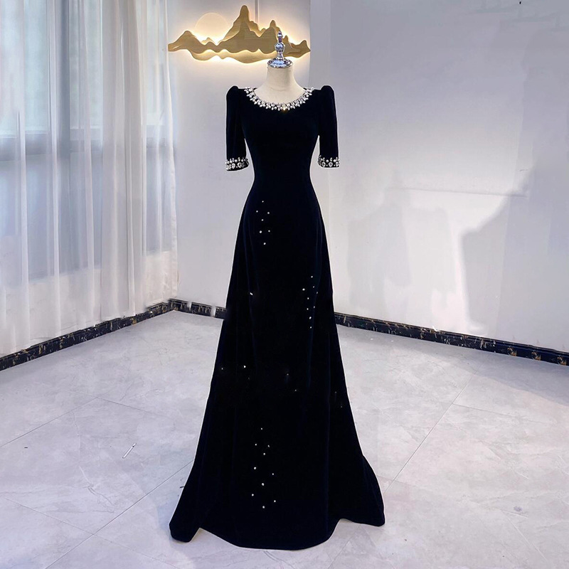 Gaun Malam Berpayet Hitam Rok Panjang Perjamuan Tuan Rumah Elegan Kelas Atas