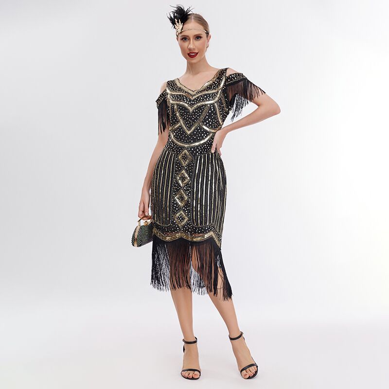 Gaun malam retro Eropa dan Amerika 1920 gaun rumbai pesta perjamuan kelas atas gaun bermanik-manik Amazon lintas batas