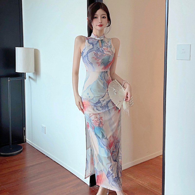 7558 Eropa Amerika Asia Tenggara Perdagangan Luar Negeri Grosir 2023 Pakaian Wanita Jala Gaya Tiongkok Modifikasi Cheongsam Gaun Panjang Ramping