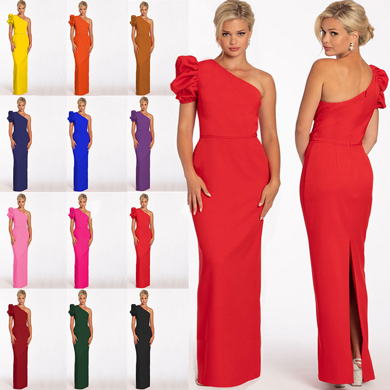 Gaun seksi satu bahu wanita populer Eropa dan Amerika baru 2024 Gaun lengan lentera temperamen terlaris Amazon