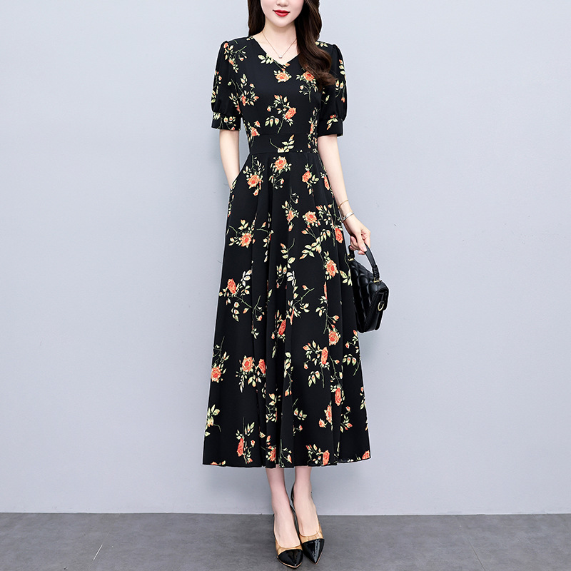 Dress panjang setengah lengan pendek, gaun cheongsam baru Cina elegan ramping bercetak ditingkatkan Musim Panas 2024