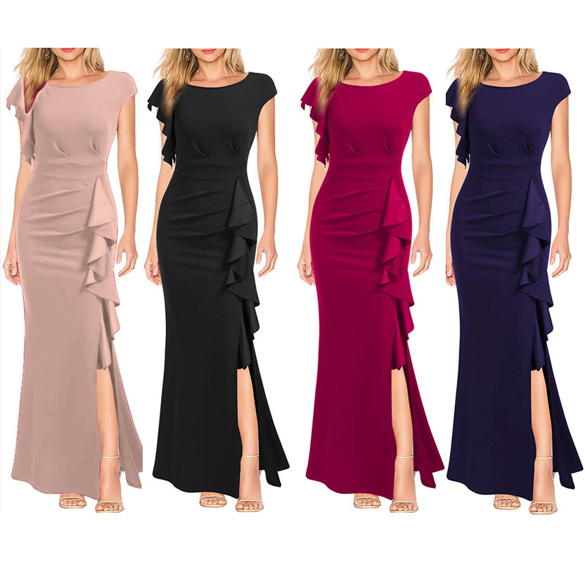 Gaun panjang wanita, gaya sosialit kelas atas 2024, desain elegan potongan tangan, gaya solid
